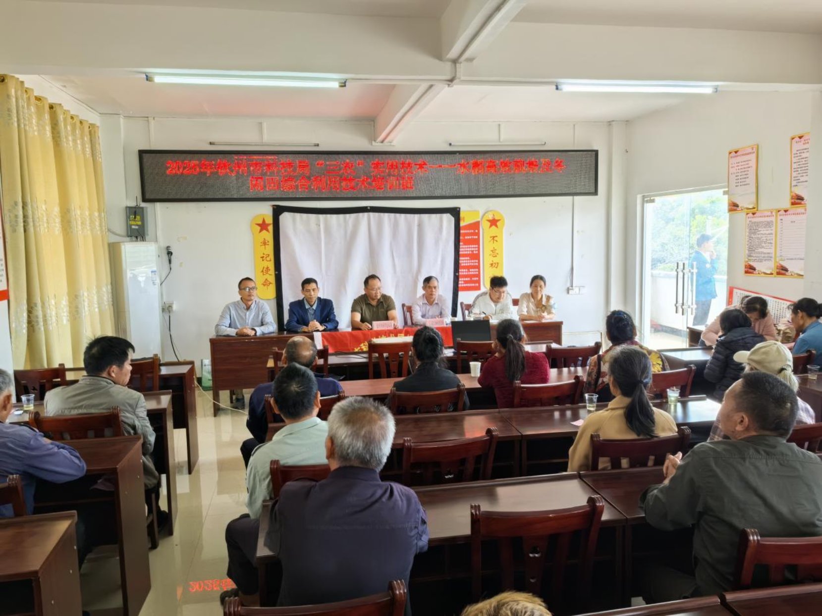 为破解水稻种植瓶颈、盘活冬闲田资源,10月21日,钦州市科技局、市星火计划管理中心在灵山县新圩镇急水村举办水稻高效种植及冬闲田间综合利用技术培训班,全村 40 余名种粮大户、农户代表现场参训。