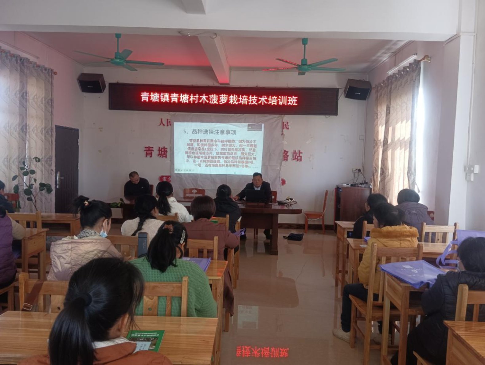 培训中,黄永钦高级工程师系统讲解了木菠萝种植所需的土壤、气候等基础条件,并聚焦种植户普遍关心的田间管理问题,围绕土地整理、苗木选育、科学种植、日常管护、合理施肥、病虫害防治、修剪整形及果实保护等关键环节,进行了深入浅出的讲解。参训群众认真聆听,学习氛围浓厚。