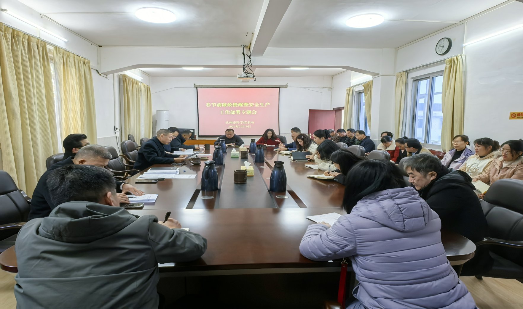 春节将至,岁暖情浓。为深入贯彻落实上级关于全面从严治党和安全生产工作的决策部署,切实压实廉政建设和安全生产责任,防范化解节日期间各类风险隐患,强化全局干部职工廉洁自律意识和安全生产责任意识,营造风清气正、安定祥和的春节氛围,近日,市科技局召开春节前廉政提醒暨安全生产工作部署专题会。局党组书记邱军辉主持会议并讲话,局领导班子成员、各科室及局属单位全体干部职工参加会议。